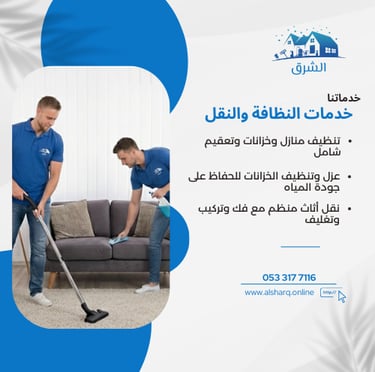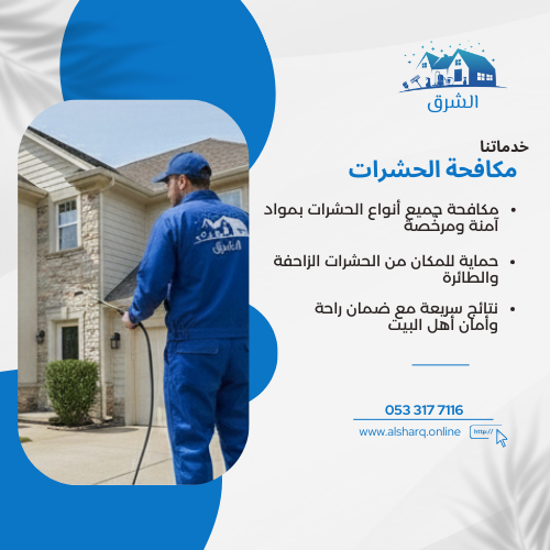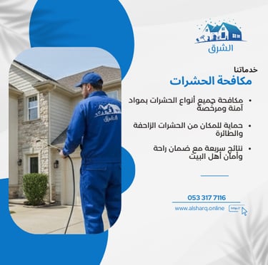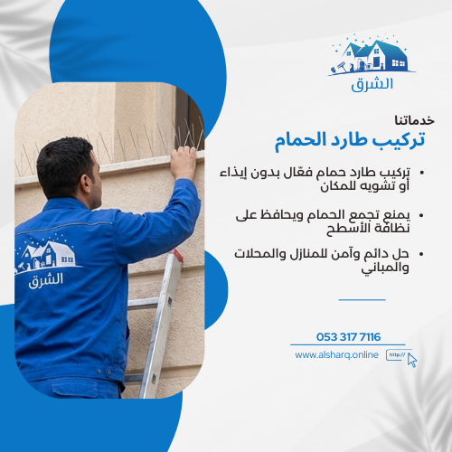 شركة الشرق للخدمات المنزلية متخصصة في تقديم حلول عملية واحترافية للحفاظ على نظافة وحماية المنازل والمباني. نركّز بشكل أساسي على تركيب طارد الحمام باستخدام طرق آمنة وفعّالة تمنع تجمع الحمام وتحافظ على نظافة المكان دون تشويه. كما نقدم خدمات مكافحة الحشرات، تنظيف المنازل والخزانات، ونقل الأثاث، مع الالتزام بالجودة، السرعة، ورضا العميل من أول زيارة.
