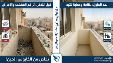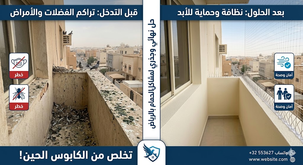 "تعبت من منظر واجهة بيتك وروائح فضلات الحمام الكريهة؟ تراكمها مو بس يشوه المنظر، هذا خطر على صحة عائلتك ويجذب الحشرات. اكتشف كيف نخلصك من كابوس الحمام في الرياض بحلول جذرية، تنظيف عميق، وتركيب طوارد أصلية بضمان يبرد قلبك. ادخل وشوف الحل!